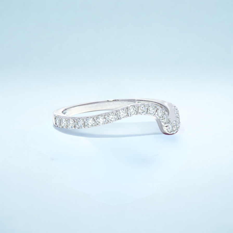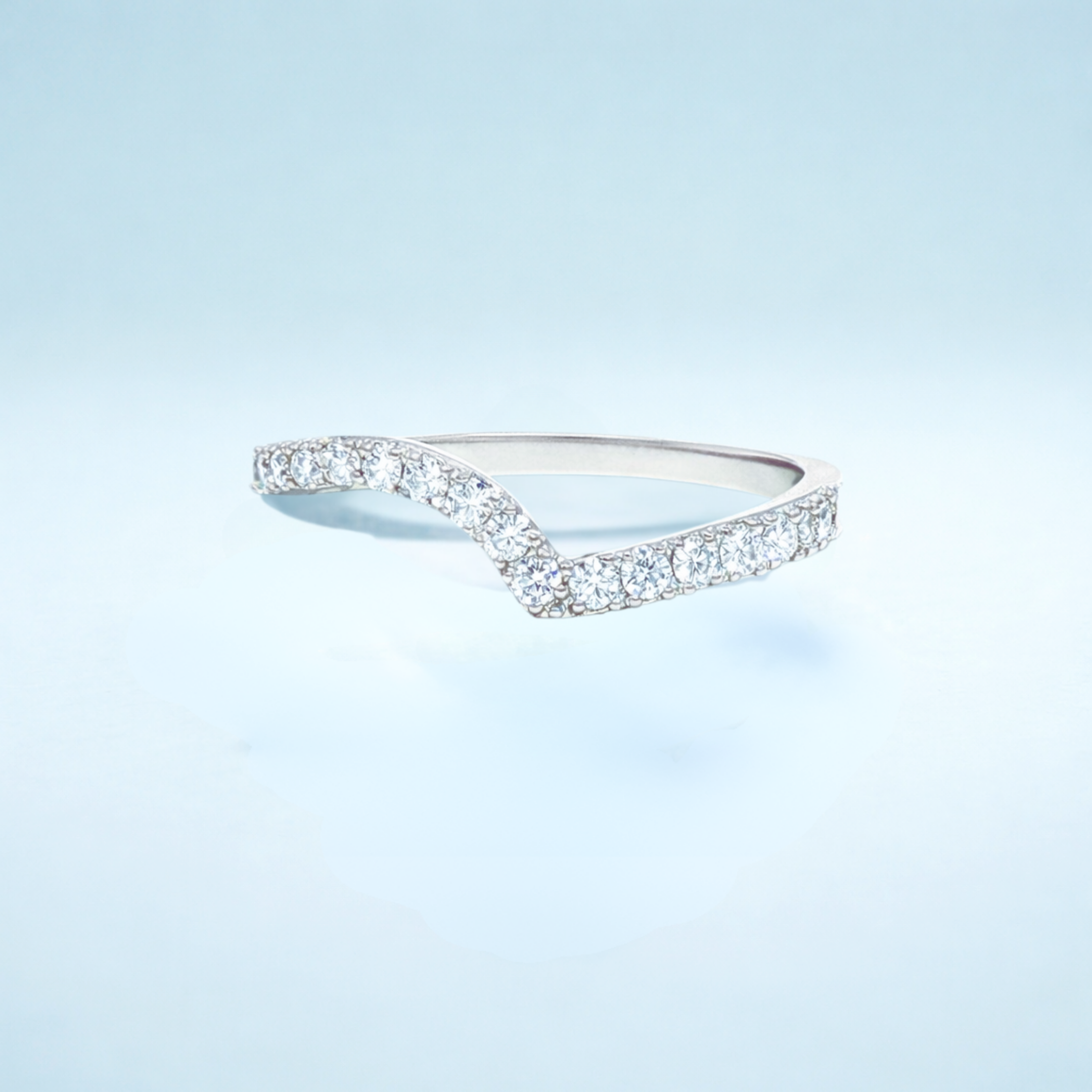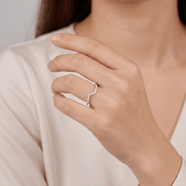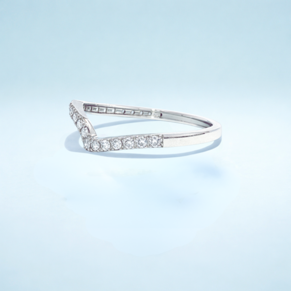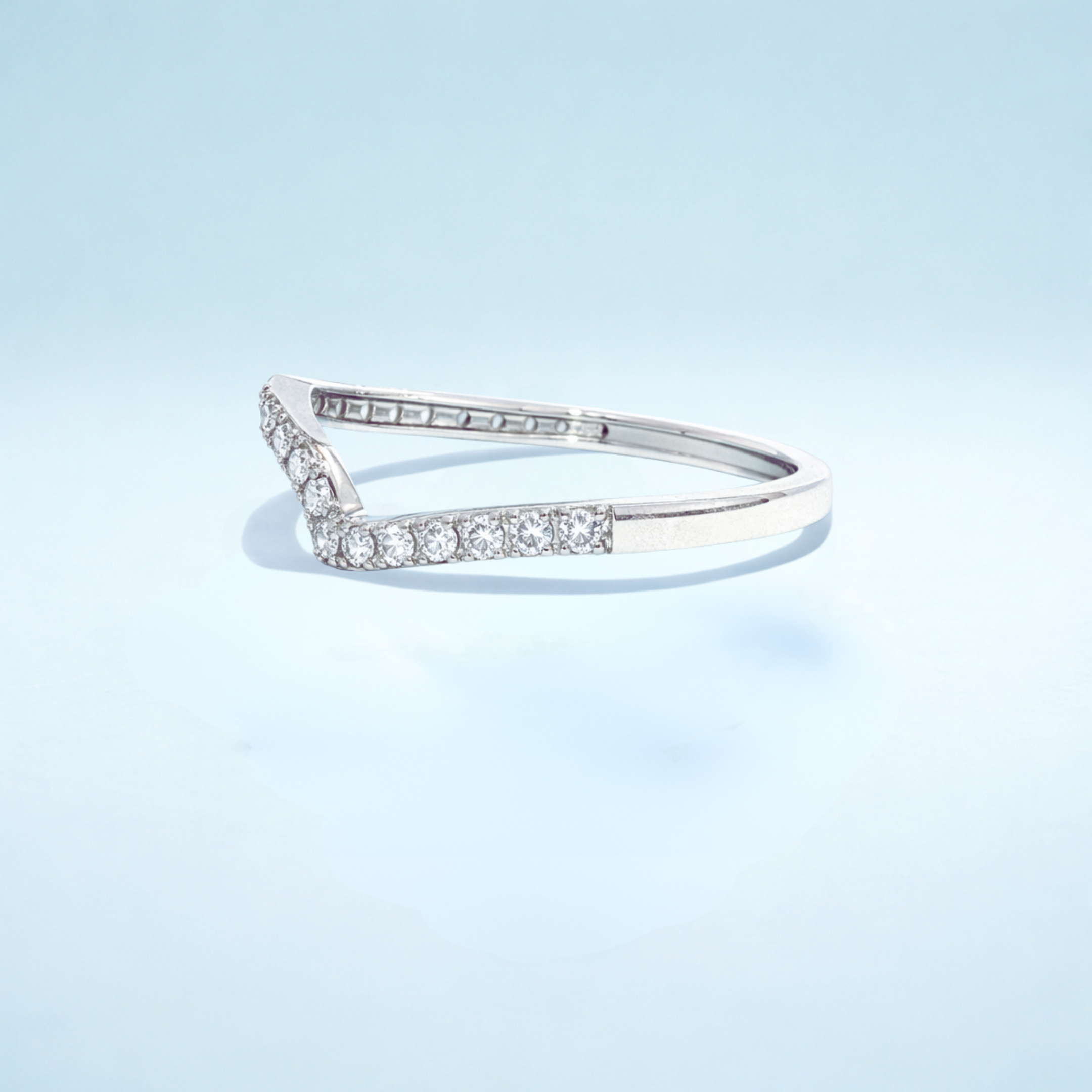 Dáng chữ V tinh gọn ôm theo đường cong tự nhiên của bàn tay, tạo cảm giác thanh thoát và hiện đại. Hàng đá tròn cắt brilliant được đính pavé mang lại độ lấp lánh vừa đủ, bắt sáng tinh tế trong từng chuyển động mà vẫn giữ được vẻ tối giản, thanh lịch.
