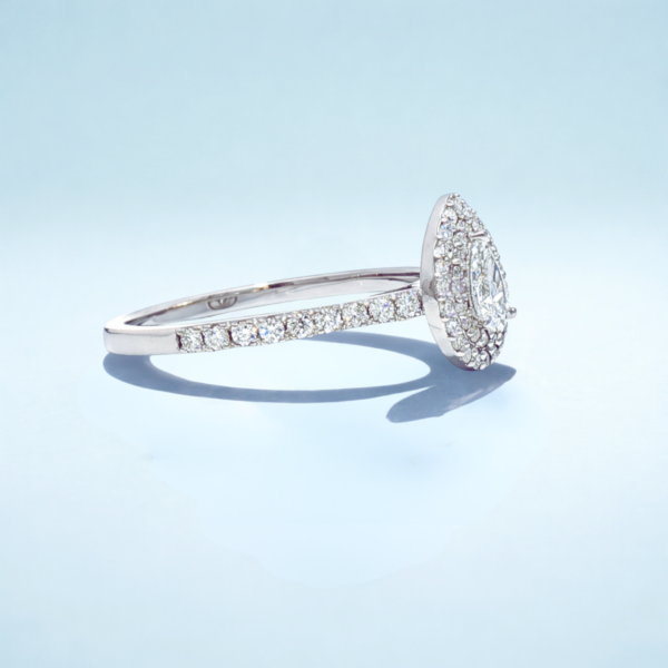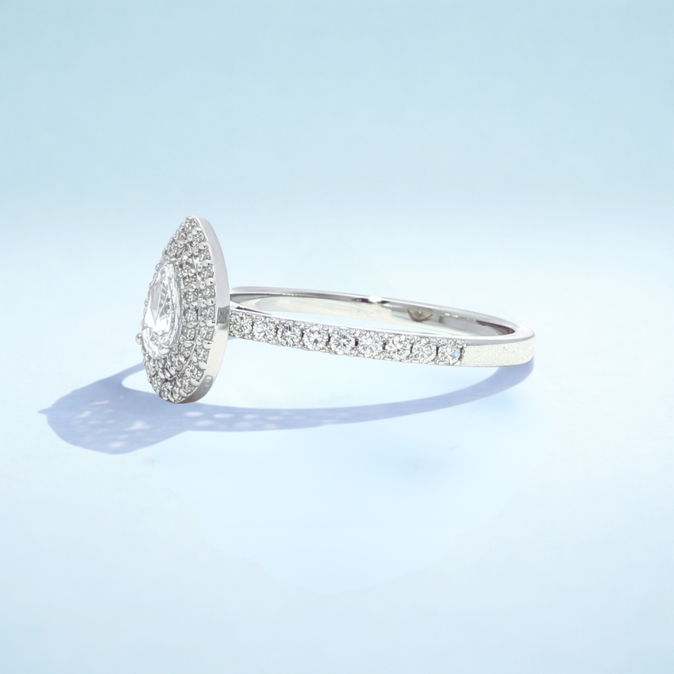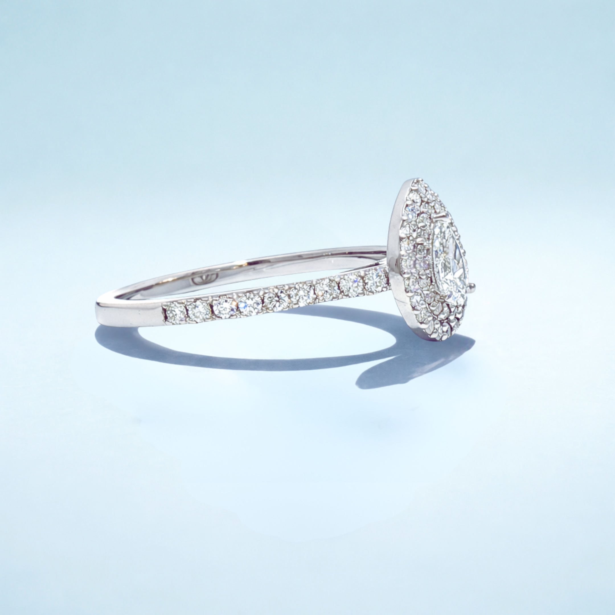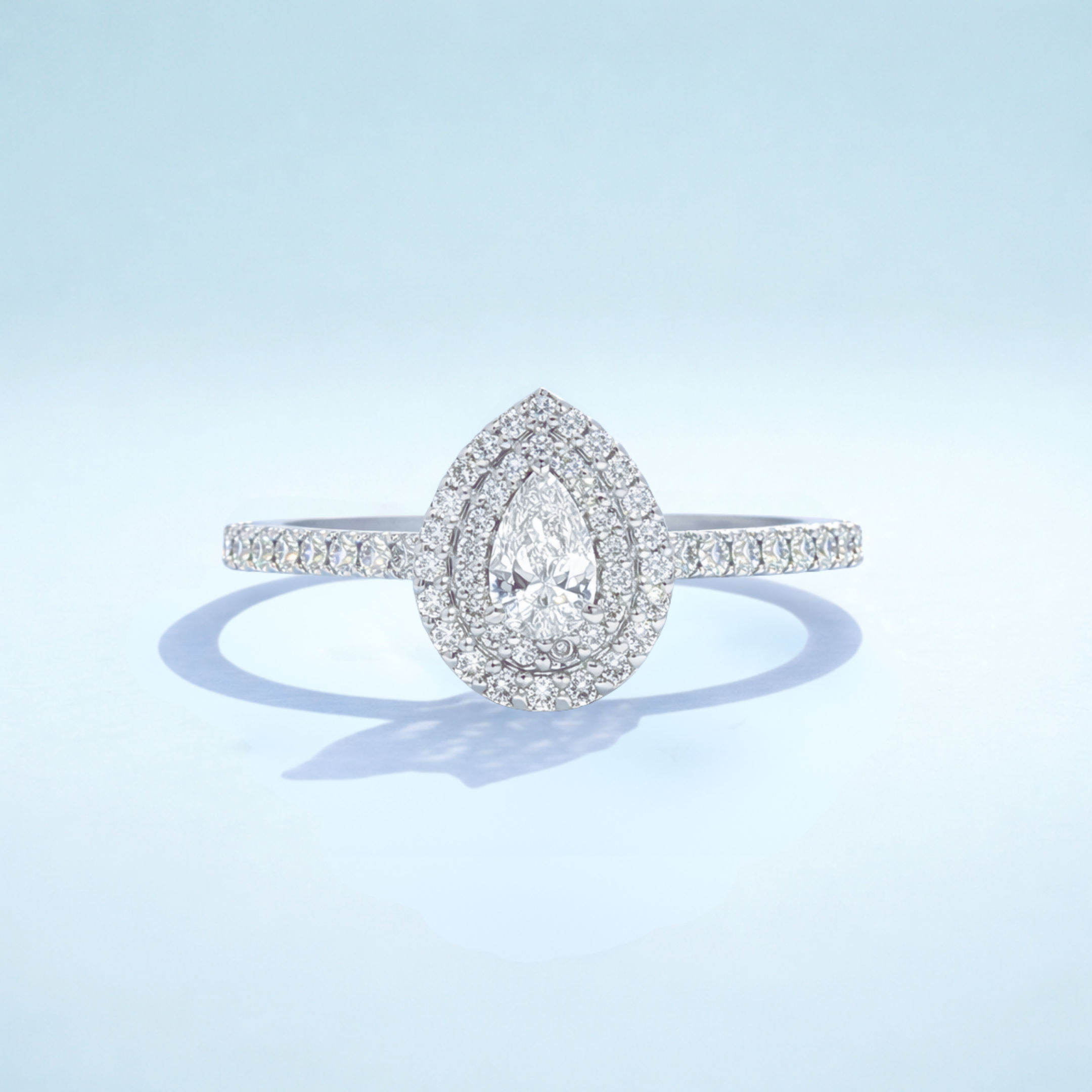 Viên đá trung tâm cắt dáng giọt nước thu hút ánh nhìn bằng vẻ lấp lánh mềm mại, tượng trưng cho sự cân bằng và tiến về phía trước. Bao quanh là vòng halo tinh xảo giúp khuếch đại ánh sáng từ mọi góc nhìn, trong khi vẫn giữ được nét thanh lịch nhẹ nhàng. Phần thân nhẫn pavé hoàn thiện thiết kế với độ lấp lánh vừa đủ, tạo nên một tổng thể vượt thời gian nhưng vẫn mang tinh thần hiện đại.