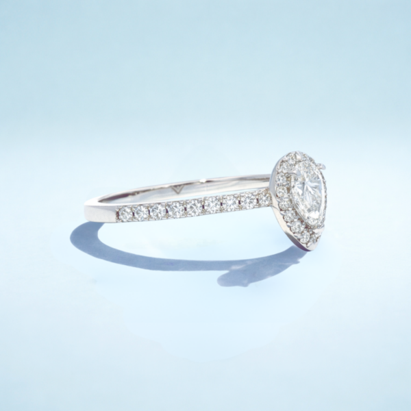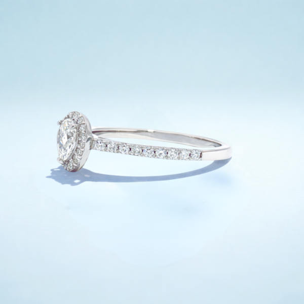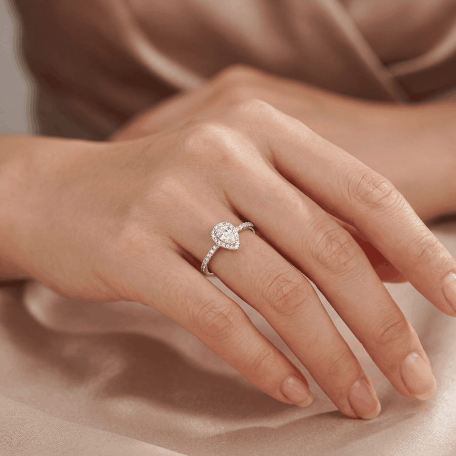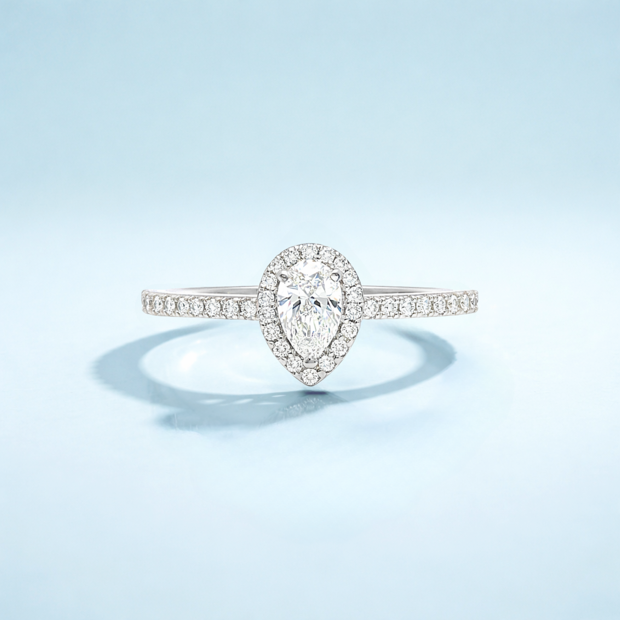 Viên đá trung tâm cắt dáng giọt nước trở thành điểm nhấn chính, phản chiếu ánh sáng một cách nhẹ nhàng và đầy tinh tế. Vòng halo mảnh bao quanh giúp tăng thêm độ lấp lánh mà không làm mất đi vẻ đẹp tự nhiên của viên đá. Phần thân nhẫn pavé hoàn thiện thiết kế với chi tiết vừa đủ, tạo nên một tổng thể vượt thời gian nhưng vẫn mang tinh thần hiện đại.