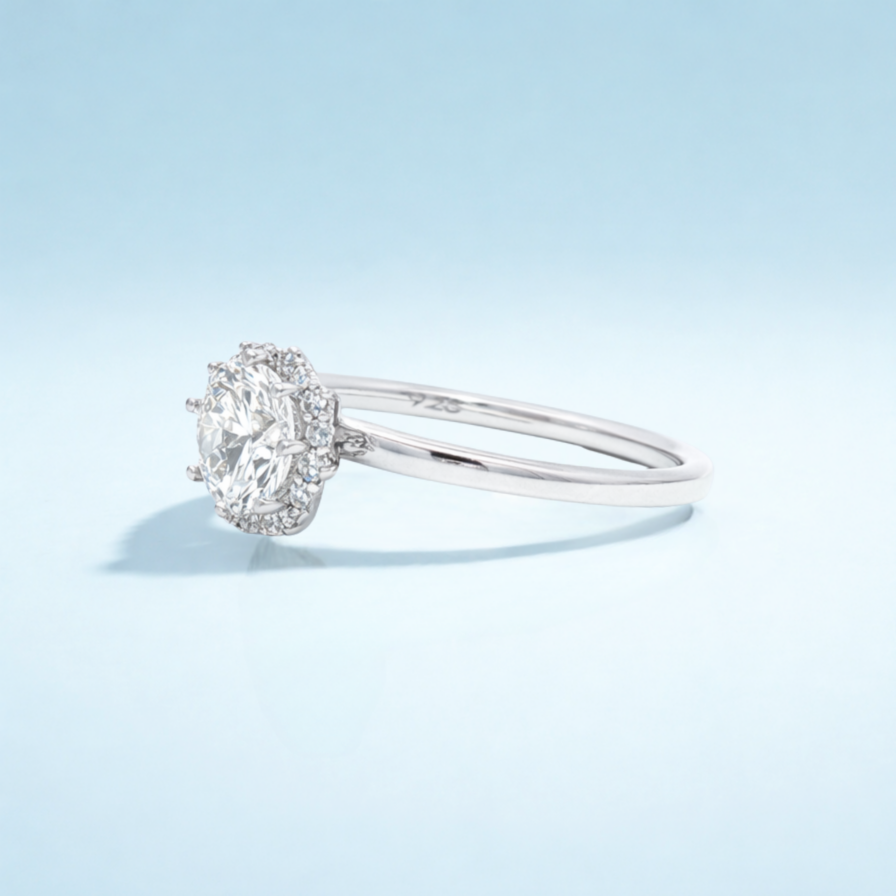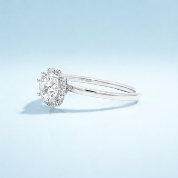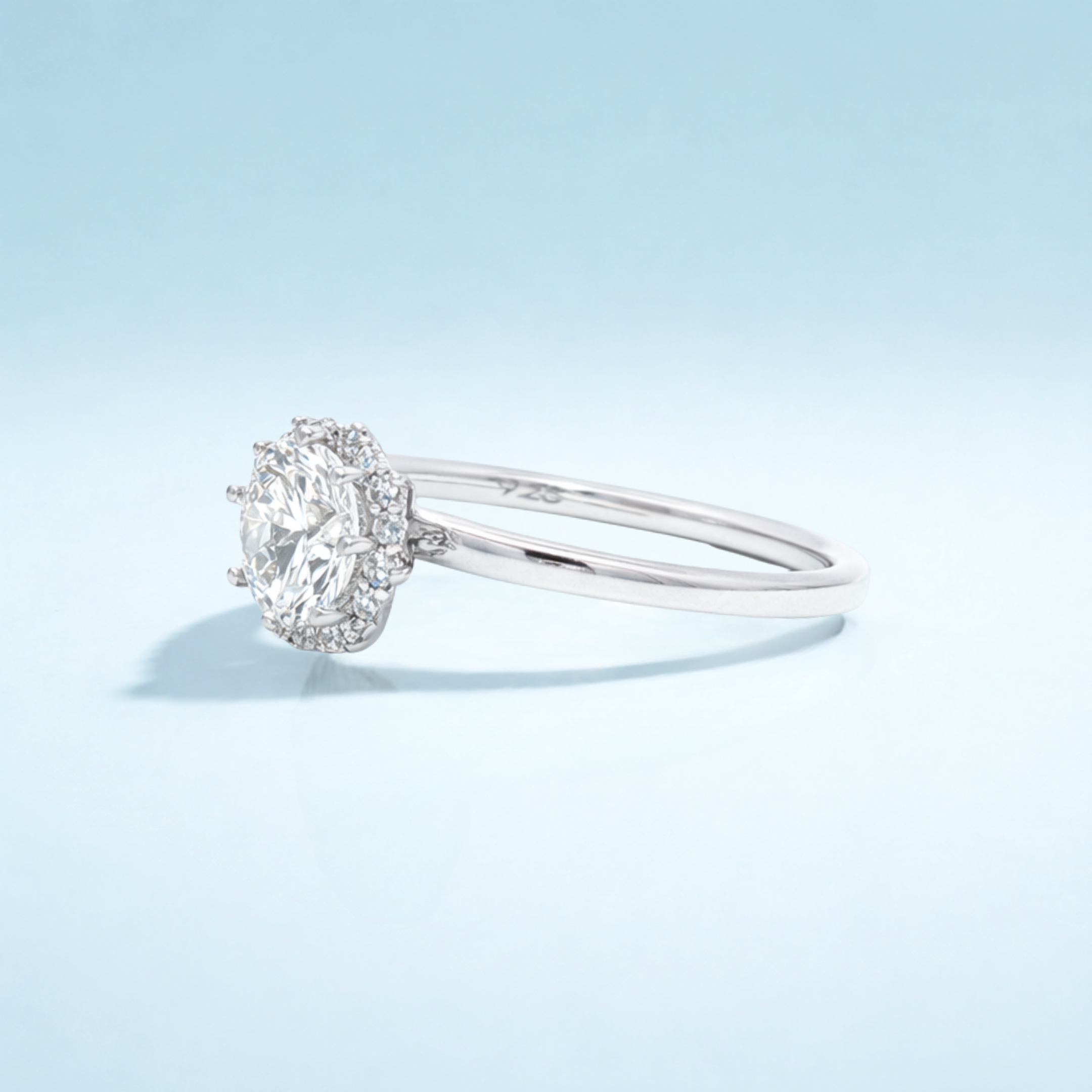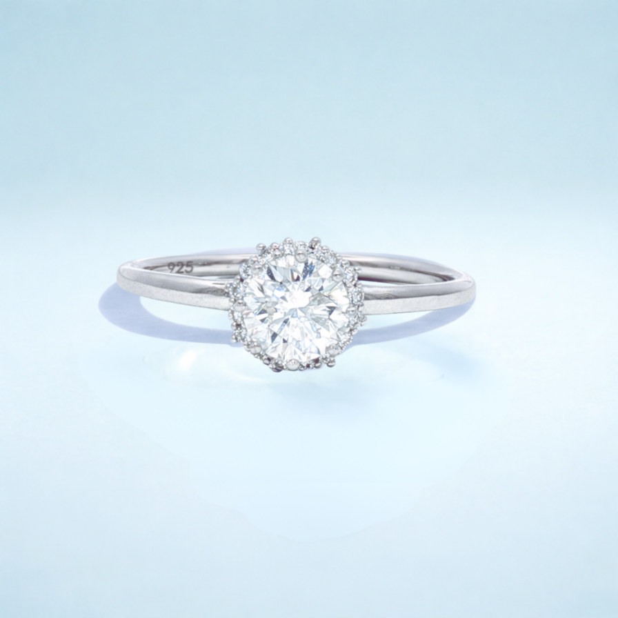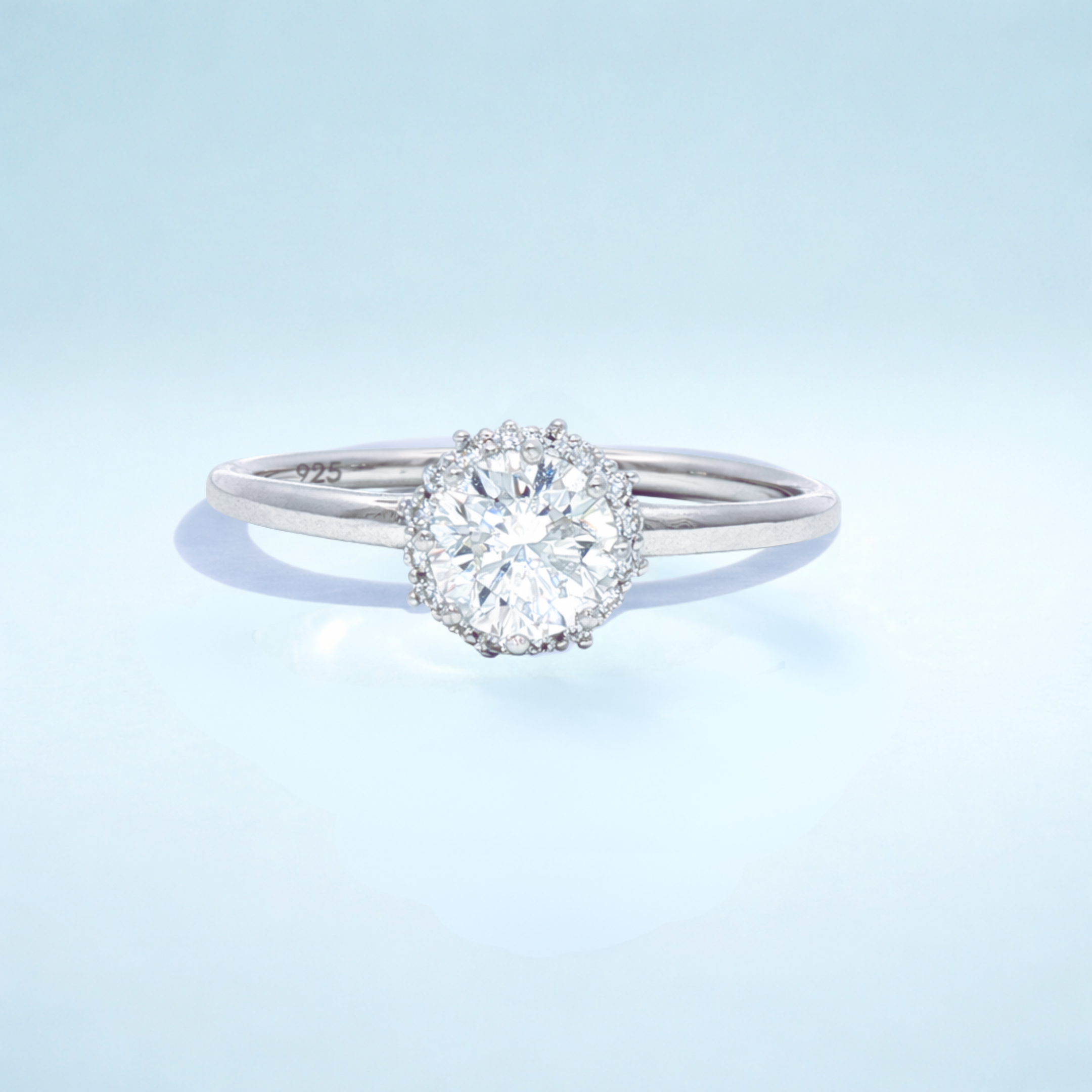 Thiết kế nhẫn halo thanh lịch với viên kim cương tròn trung tâm rực rỡ, được bao quanh bởi vòng halo tinh tế. Chế tác từ bạc 925 mạ rhodium, mang vẻ đẹp vượt thời gian.