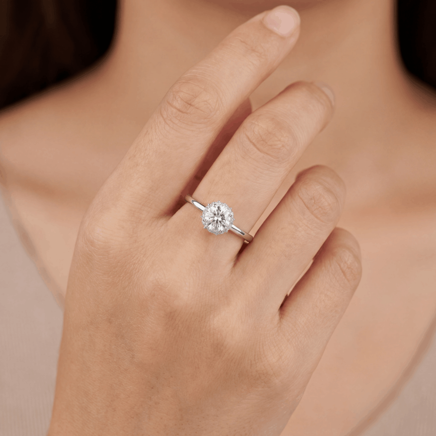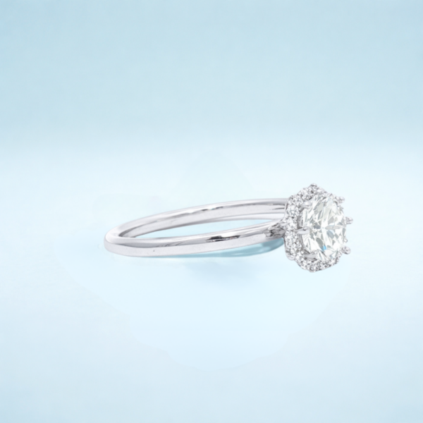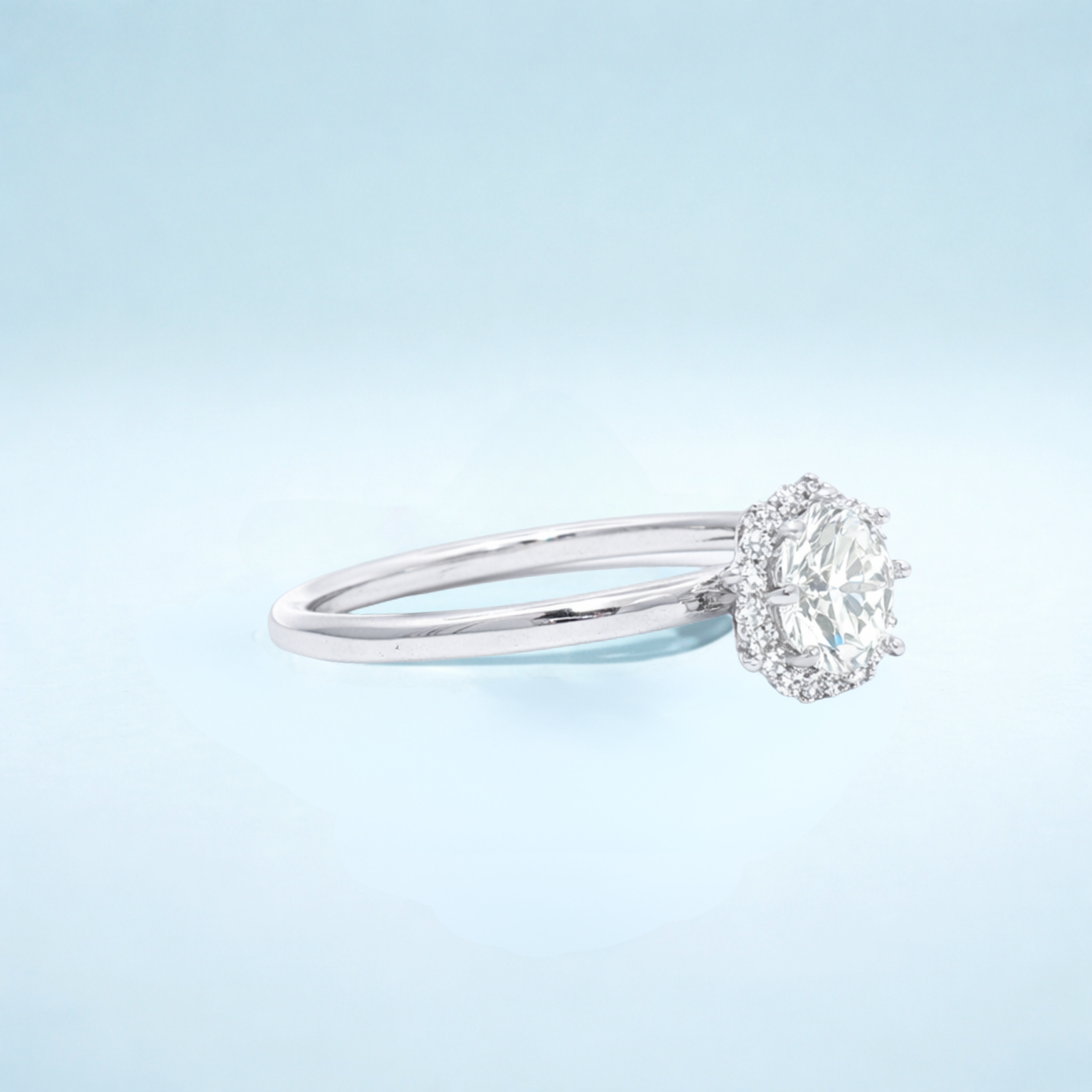 Viên kim cương tròn brilliant ở trung tâm được bao quanh bởi vòng halo gồm các viên đá nhỏ, giúp tăng độ lấp lánh mà vẫn giữ được phom dáng cân đối, gọn gàng. Phần thân nhẫn trơn, được đánh bóng, giúp toàn bộ sự chú ý dồn vào viên đá chính và vòng halo, tạo nên vẻ đẹp nhẹ nhàng, nữ tính nhưng không kém phần sang trọng. Thiết kế mang nét cổ điển nhưng vẫn rất hiện đại, phù hợp cho những ai yêu thích sự tinh giản có chiều sâu.
