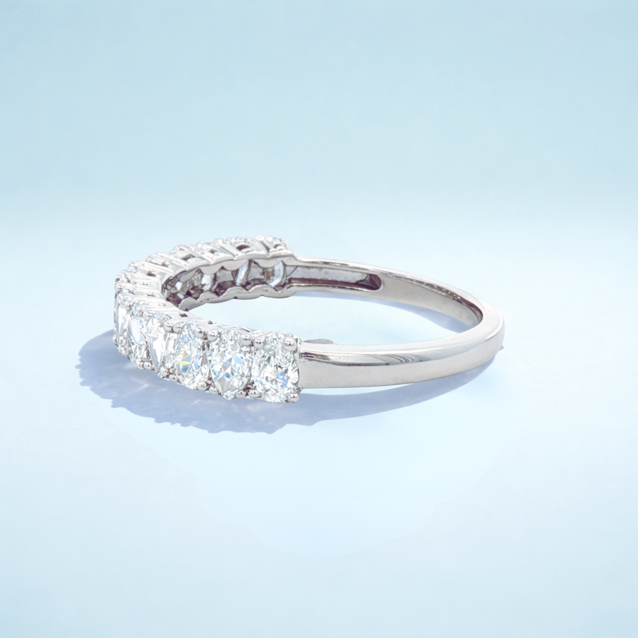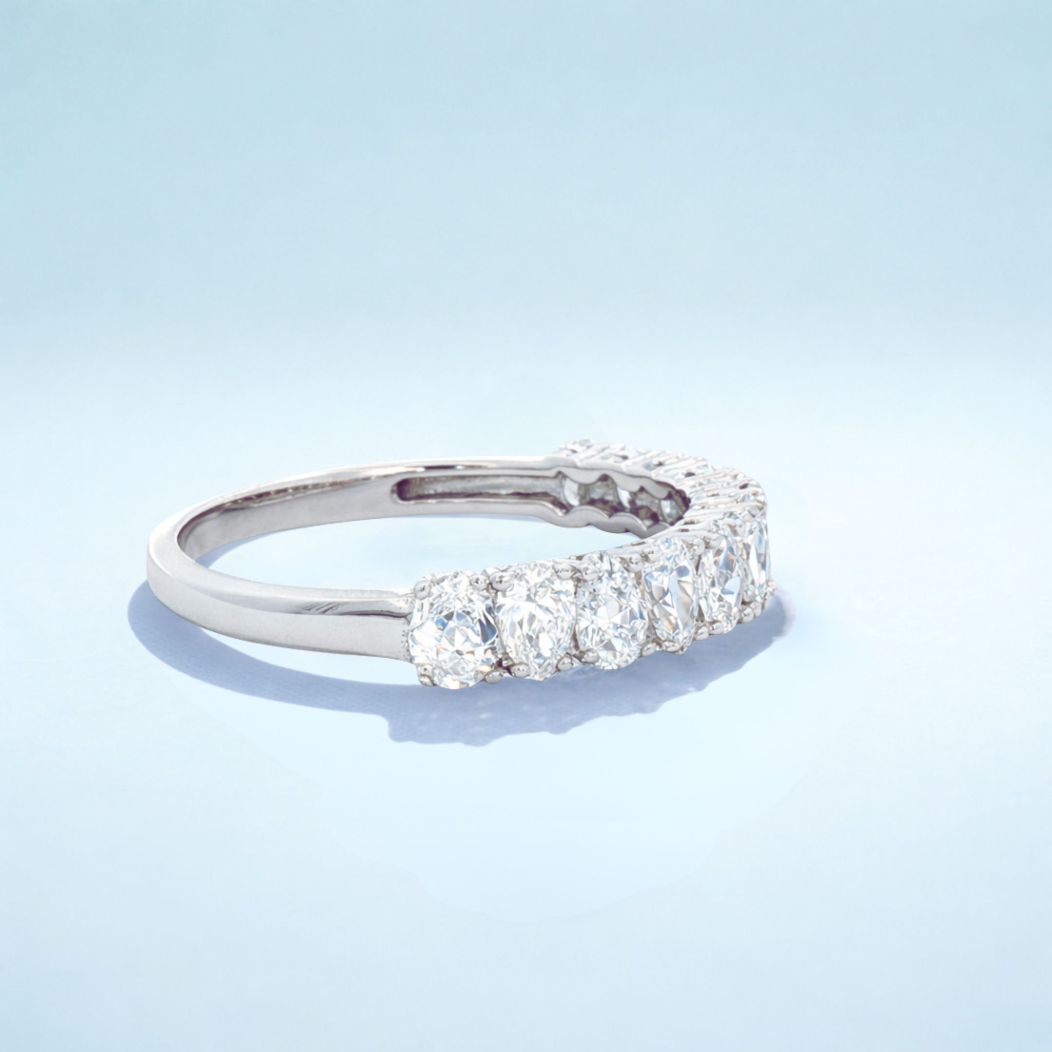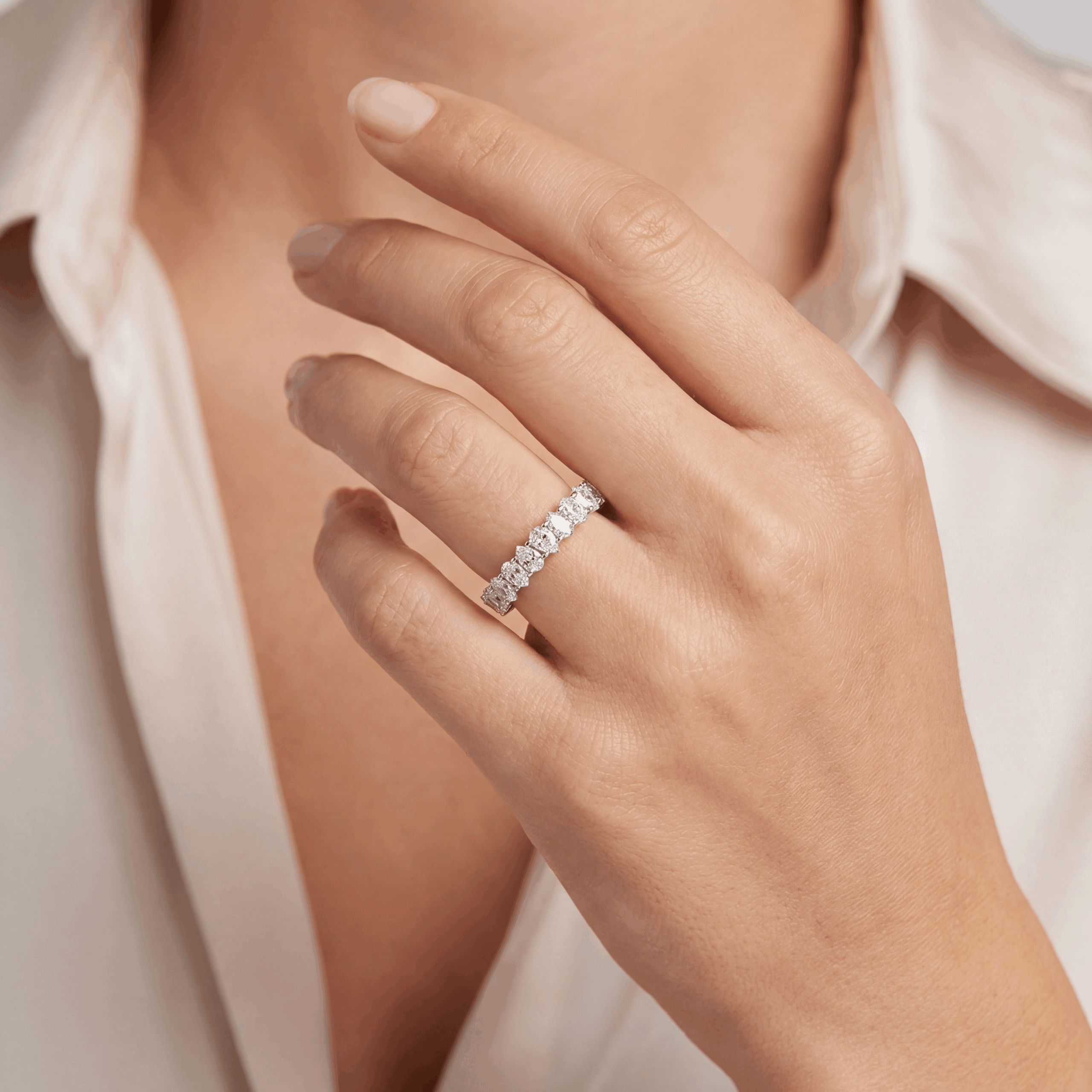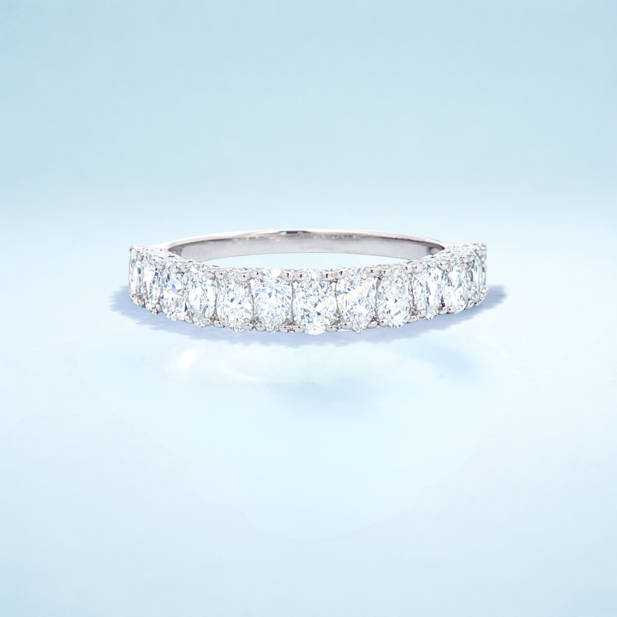 Các viên kim cương dáng giọt nước được sắp xếp theo phương ngang dọc theo nửa trên của thân nhẫn, tạo nên một đường ánh sáng liền mạch, mềm mại quanh ngón tay. Kiểu đính đặc biệt này giúp tăng độ bắt sáng mà vẫn giữ được phom dáng thanh thoát, hiện đại. Thiết kế vừa cổ điển, vừa mới mẻ tinh tế trong từng chi tiết nhưng đủ nổi bật để sử dụng hằng ngày.