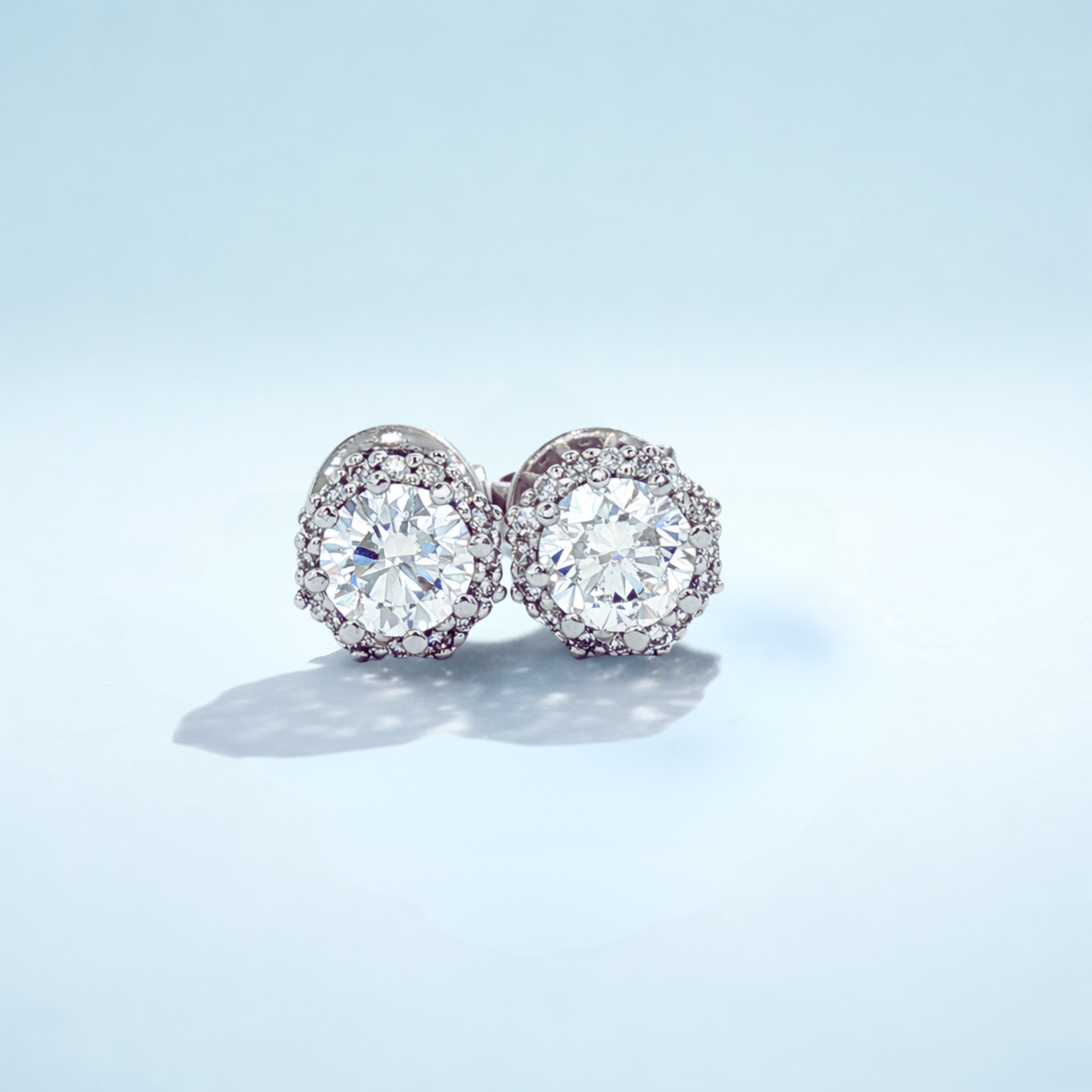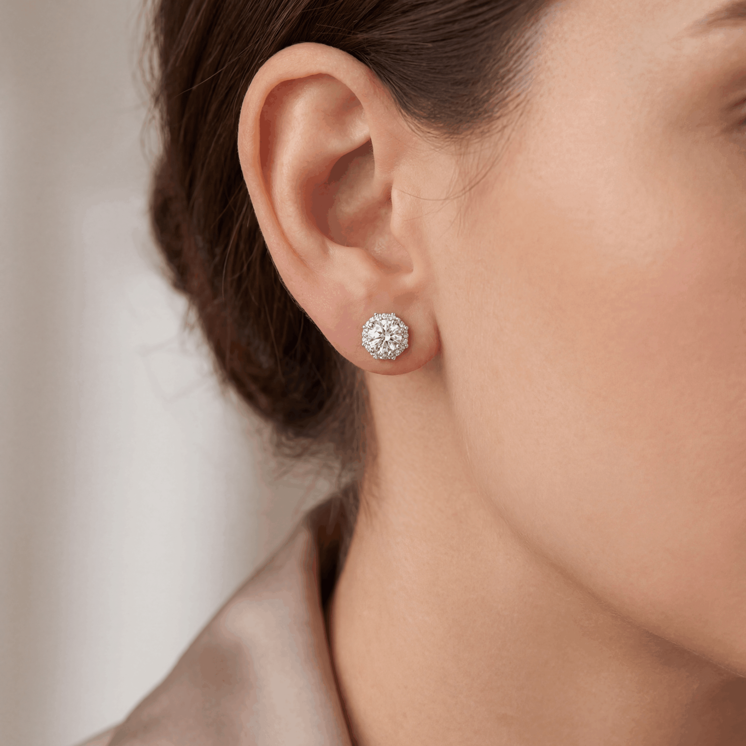 Viên kim cương tròn trung tâm tượng trưng cho sự vững vàng và tự tin, trong khi vòng halo bao quanh tạo hiệu ứng ánh sáng mềm mại, giúp tổng thể đôi khuyên tai trở nên rực rỡ hơn mà vẫn giữ được sự tinh giản.