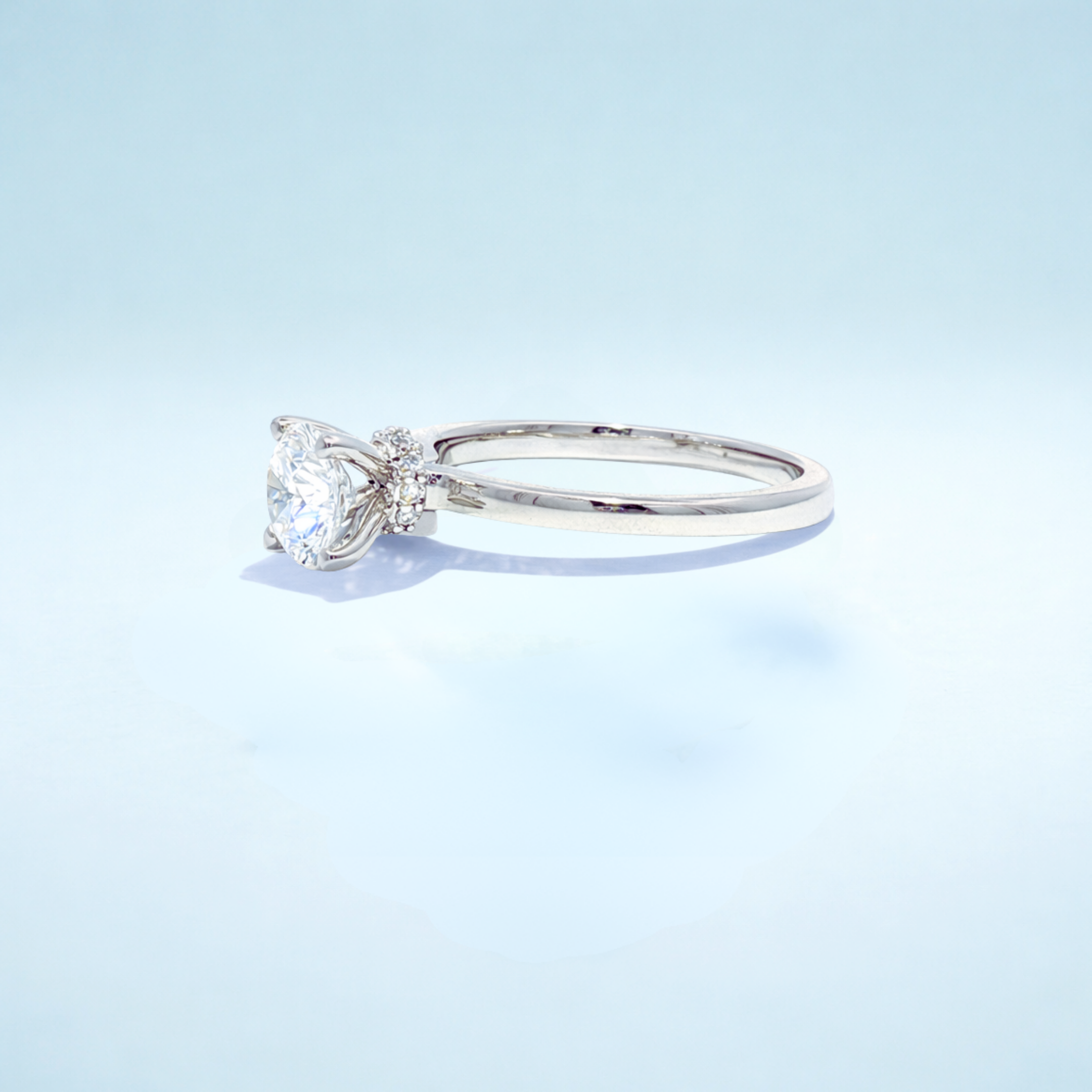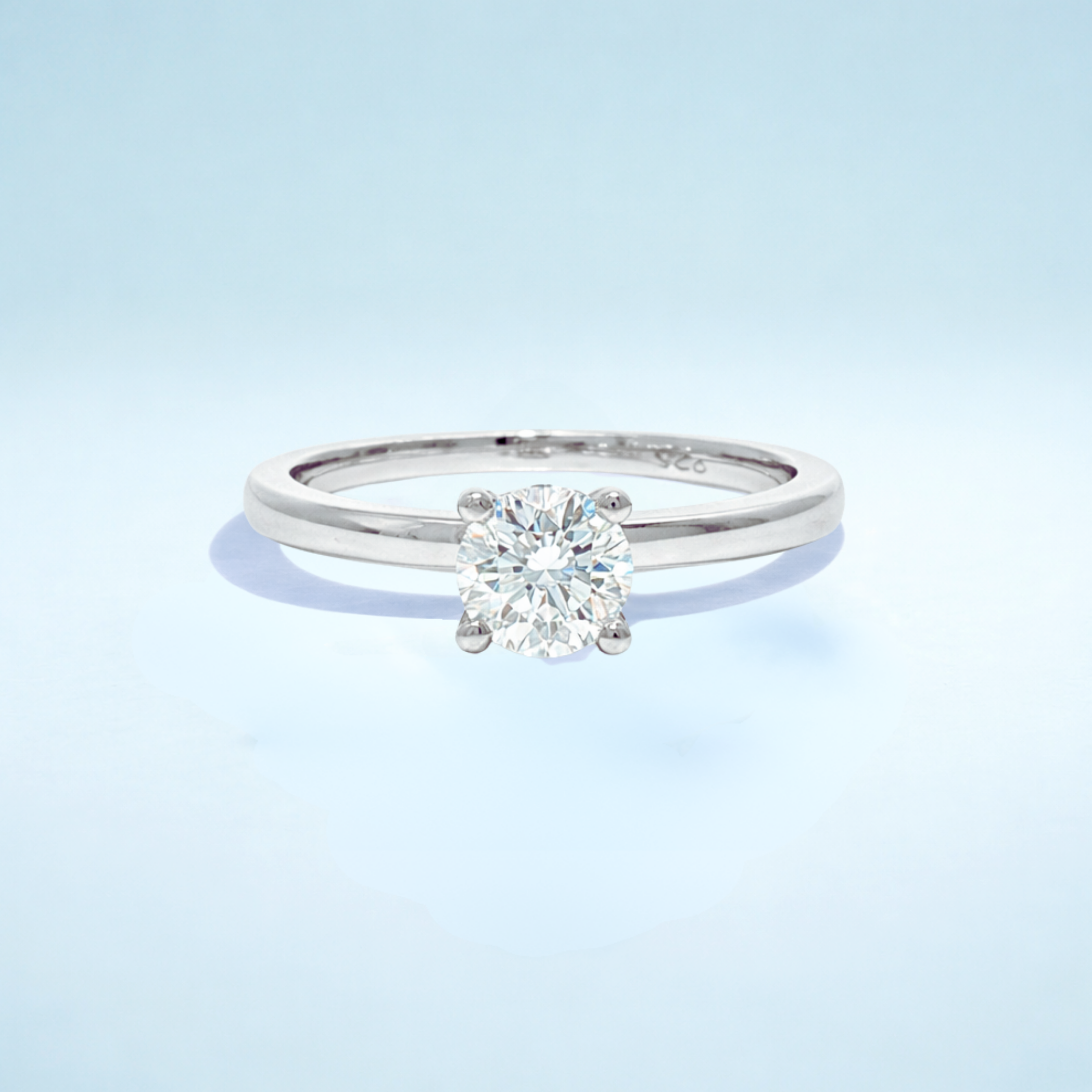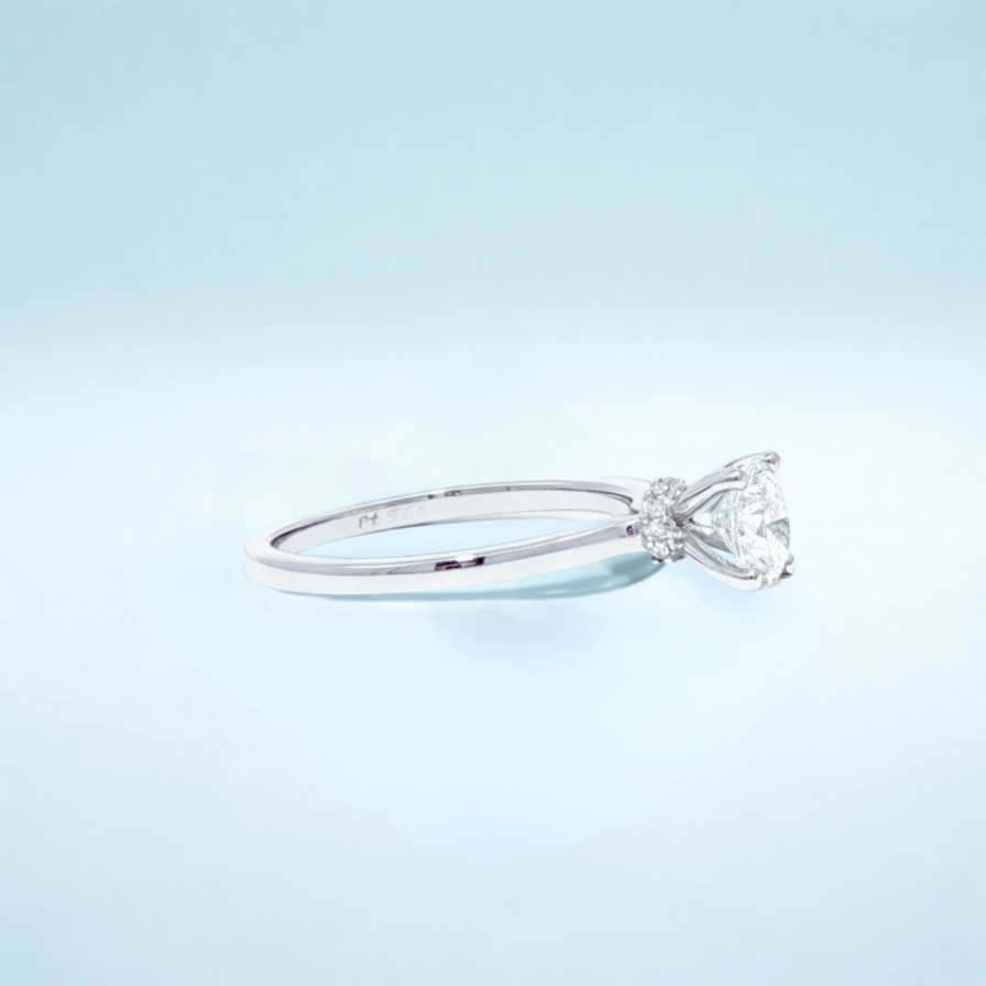 Viên kim cương tròn brilliant ở trung tâm được giữ bởi chấu bốn, nâng nhẹ để ánh sáng có thể đi vào từ mọi góc độ, tối ưu độ lấp lánh. Thân nhẫn trơn, được đánh bóng, uốn cong hài hòa hướng về viên đá chính, tạo nên phom dáng kiến trúc gọn gàng và tinh giản. Thiết kế mang cảm giác điềm tĩnh, tự tin tối giản về hình thức nhưng mạnh mẽ về hiện diện.